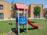 The slide is made from fibreglass. The surface of the slide is made from high quality HDPE plastic (high density coloured polyethylene, which is characterised by high colour stability, UV resistance but mainly safety as it doesn't break and therefore there is no danger of injury to children by sharp fragments). The platform is made from HPL (High-pressure laminate, which is characterised by high colour stability and water resistance). The roof is made from HPL (High-pressure laminate, which is characterised by high colour stability, UV resistance and water resistance). All fastening material is galvanized or stainless steel.