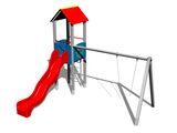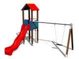 Seats and hinges are not part of the swing. It is necessary to buy a seat (1 pieces) of your choice and curtains (2 pieces). Tower, slide, A-shaped roof, 2x barrier, ladder, metal beam. More information