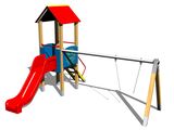 Seats and hinges are not part of the swing. It is necessary to buy a seat (1 pieces) of your choice and curtains (2 pieces). Tower, slide, A-shaped roof, 2x barrier, sloping ramp with steps and metal handles, metal beam. More information