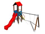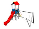 Seats and hinges are not part of the swing. It is necessary to buy a seat (1 pieces) of your choice and curtains (2 pieces). Tower, slide, A-shaped roof, 2x barrier, sloping ramp with steps and metal handles, metal beam. More information