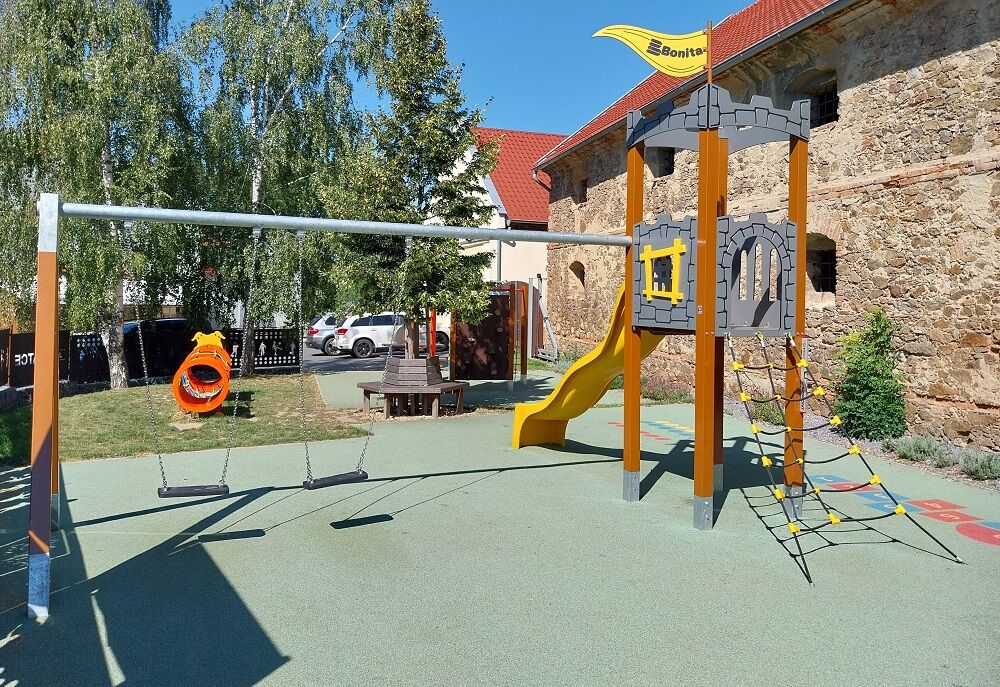 Seats and hinges are not part of the swing. It is necessary to buy a seat (2 pieces) of your choice and curtains (4 pieces). Tower, slide, 2x barrier from HDPE, sloping net access, vertical climbing wall on the tower with steps, flag, battlements from HDPE, metal beam. More information
