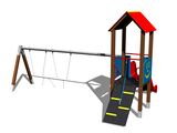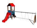 Seats and hinges are not part of the swing. It is necessary to buy a seat (2 pieces) of your choice and curtains (4 pieces). Tower, slide, A-shaped roof, 2x barrier, sloping ramp with the rope and HDPE steps, twin chain swing. More information