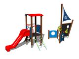 Tower, slide, arched roof, barrier, post with a flag, drawing board, sloping net access, anchor, helm made from HDPE, 2x barrier with an aperture, sloping ramp with steps and metal handles. More information