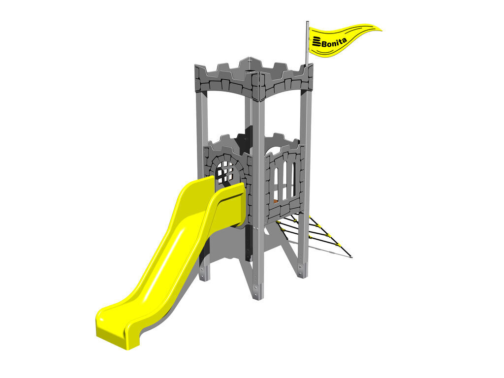 Tower, slide, 2x barrier from HDPE, sloping net access, vertical climbing wall on the tower with steps, flag, battlements from HDPE. More information