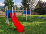 The slide is made from fibreglass. The surfaces of the slides, steps, etc. are made from high quality HDPE plastic (high density coloured polyethylene, which is characterised by high colour stability, UV resistance but mainly safety as it doesn't break and therefore there is no danger of injury to children by sharp fragments). The climbing net and the rope bridge are made using HERKULES material (16 mm thick ropes made from polypropylene with a steel internal core) and are connected with plastic or aluminium joints. The platforms are made from HPL (High-pressure laminate, which is characterised by high colour stability and water resistance). All fastening material is galvanized or stainless steel.