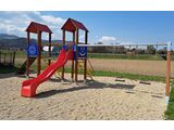 The slide is made from fibreglass. The surfaces of the slides, steps, etc. are made from high quality HDPE plastic (high density coloured polyethylene, which is characterised by high colour stability, UV resistance but mainly safety as it doesn't break and therefore there is no danger of injury to children by sharp fragments). The rope bridge is made using HERKULES material (16 mm thick ropes made from polypropylene with a steel internal core) and is connected with plastic or aluminium joints. The platforms and the sloping climbing wall are made from HPL (High-pressure laminate, which is characterised by high colour stability and water resistance). The climbing holds are made from the mix of silica sand and epoxy resin, which ensures long life, colour preservation as well as skin friendly surface. The roofs are made from HPL (High-pressure laminate, which is characterised by high colour stability, UV resistance and water resistance). All fastening material is galvanized or stainless steel.
