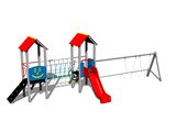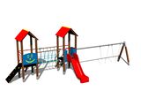 The slide is made from fibreglass. The surfaces of the slides, steps, etc. are made from high quality HDPE plastic (high density coloured polyethylene, which is characterised by high colour stability, UV resistance but mainly safety as it doesn't break and therefore there is no danger of injury to children by sharp fragments). The rope bridge is made using HERKULES material (16 mm thick ropes made from polypropylene with a steel internal core) and is connected with plastic or aluminium joints. The platforms and the sloping climbing wall are made from HPL (High-pressure laminate, which is characterised by high colour stability and water resistance). The climbing holds are made from the mix of silica sand and epoxy resin, which ensures long life, colour preservation as well as skin friendly surface. The roofs are made from HPL (High-pressure laminate, which is characterised by high colour stability, UV resistance and water resistance). All fastening material is galvanized or stainless steel.