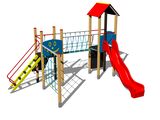 2x tower, slide, A-shaped roof, sloping ramp with the rope and HDPE steps, rope bridge, sloping ramp with steps and metal handles, vertical climbing wall, 2x barrier from HDPE. More information