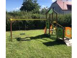 The slide is made from stainless steel. The surfaces of the slides, barriers, etc. are made from high quality HDPE plastic (high density coloured polyethylene, which is characterised by high colour stability, UV resistance but mainly safety as it doesn't break and therefore there is no danger of injury to children by sharp fragments). The rope bridge is made using HERKULES material (16 mm thick ropes made from polypropylene with a steel internal core) and are connected with plastic or aluminium joints. The platform and the ramp are made from HPL (High-pressure laminate, which is characterised by high colour stability, UV resistance and water resistance). The swing is hung on a metal girder using galvanized chains. The seat is made of rubber and is reinforced with an aluminum insert. The chains are stainless steel, resulting in a very prolonged service life of the product. All fastening material is stainless steel.