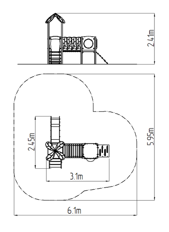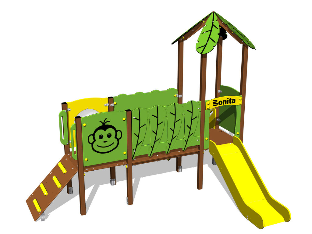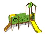 2x Tower, slide, roof in the shape of a leaf, sloping ramp with steps and HDPE handles, sloping ramp with HDPE steps, 2x barrier, ridge with plastic railings, barrier with an aperture. More information
