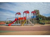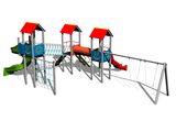 Seats and hinges are not part of the swing. It is necessary to buy a seat (2 pieces) of your choice and curtains (4 pieces). 3x tower, slide, tube slide, 3x A-shaped roof, 6x barrier from HDPE, sloping ramp with the rope and HDPE steps, sloping ramp with steps and metal handles, crawl tunnel between the towers, rope bridge, metal beam, vertical climbing net. More information