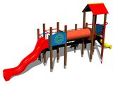 4x tower, 2x slide, sloping climbing wall with climbing holds, sloping ramp with the rope and HDPE steps, ladder, 2x barrier from HDPE, fire pole, crawl tunnel between the towers, bridge with a rope railing, A-shaped roof. More information