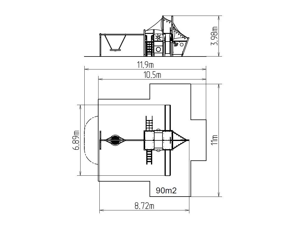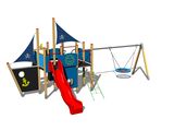 6x tower, 2x slide, 2x metal railing set in a wooden frame, 2x post with a flag, sloping net access, helm made from HDPE, 4x barrier from HDPE, 2x barrier with an aperture, sloping ramp with steps and metal handles, drawing board with an anchor, chain swing. More information