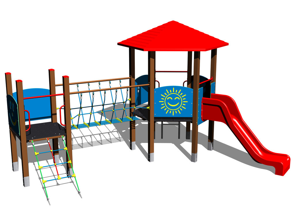 The slide is made from fibreglass. The surfaces of the slide, steps, etc. are made from high quality HDPE plastic (high density coloured polyethylene, which is characterised by high colour stability, UV resistance but mainly safety as it doesn't break and therefore there is no danger of injury to children by sharp fragments). The climbing net and the rope bridge are made using HERKULES material (16 mm thick ropes made from polypropylene with a steel internal core) and are connected with plastic or aluminium joints. The platforms are made from HPL (High-pressure laminate, which is characterised by high colour stability and water resistance). All fastening material is galvanized or stainless steel.