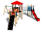 The slide is made from fibreglass. The surfaces of the slides, steps, etc. are made from high quality HDPE plastic (high density coloured polyethylene, which is characterised by high colour stability, UV resistance but mainly safety as it doesn't break and therefore there is no danger of injury to children by sharp fragments). The rope bridge is made using HERKULES material (16 mm thick ropes made from polypropylene with a steel internal core) and is connected with plastic or aluminium joints. The platforms and the sloping climbing wall are made from HPL (High-pressure laminate, which is characterised by high colour stability and water resistance). The climbing holds are made from the mix of silica sand and epoxy resin, which ensures long life, colour preservation as well as skin friendly surface. The crawler tunnel is made of laminate. All fastening material is galvanized or stainless steel.